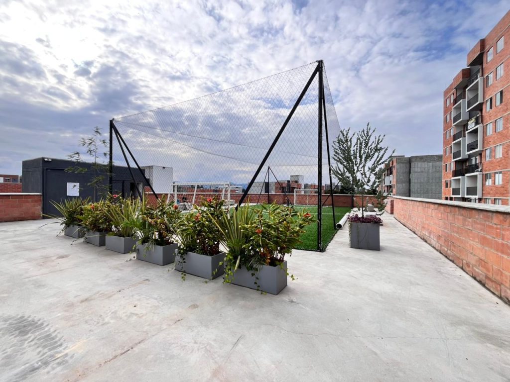 Zona de Yoga, zona de mascotas, casa de muñecas, pista de triciclos, mirador ecológico, zona de BBQ, parqueadero de bicicletas, cancha sintética, juegos infantiles, salón social, gimnasio cubierto, circuito workfit.